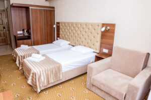 2-х местный 1-но комнатный номер 1 категории «Стандарт+» (18-20м2), корпус №1 – две раздельные кровати-трансформеры, раскладной диван телевизор, холодильник, сплит-система, санузел. Дополнительное место – раскладной диван или кресло максимально 2+2 чел.